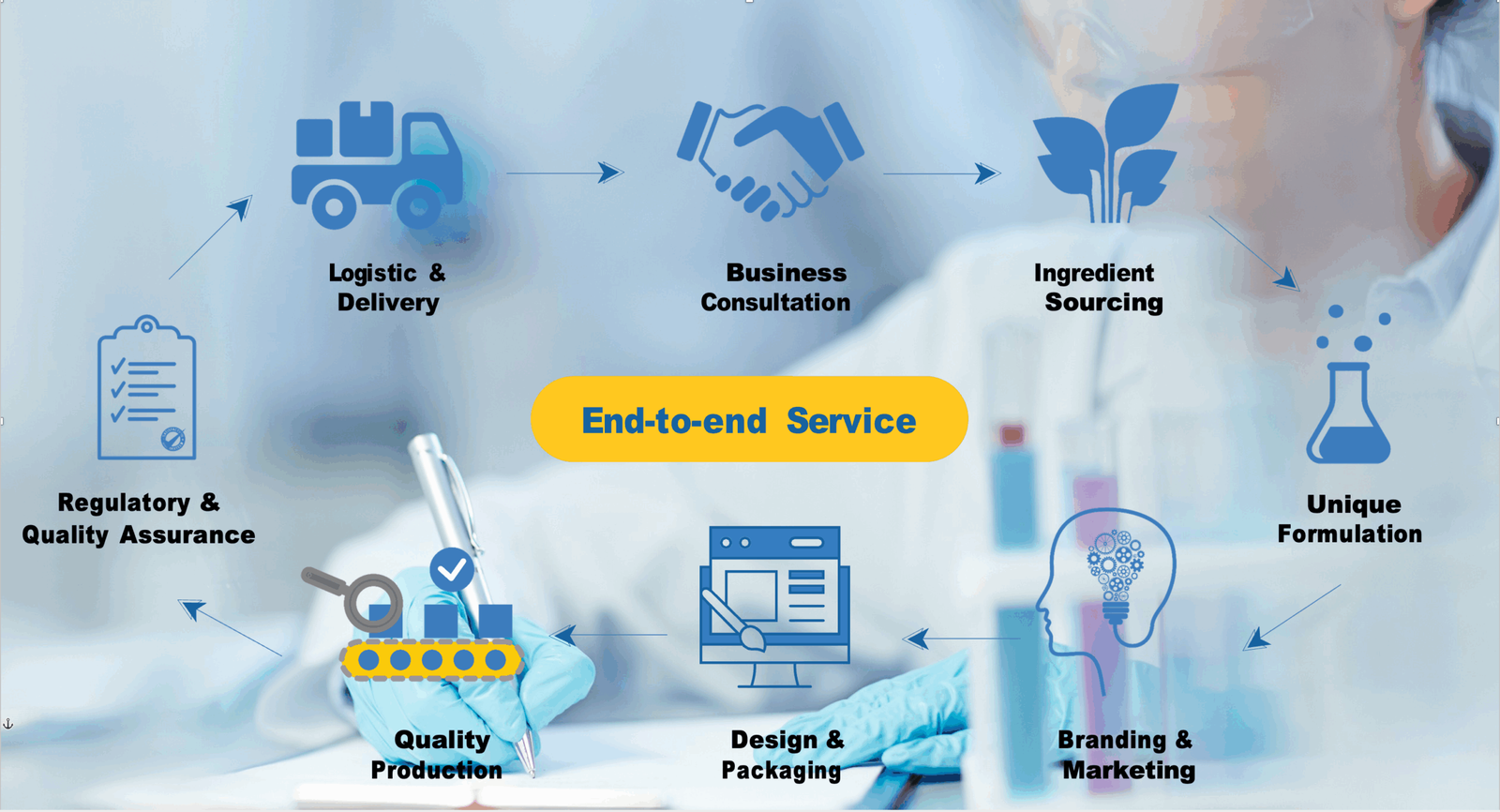We create complete solutions from consultation, ingredients sourcing, formulation, design and packaging, regulatory service, branding and marketing to final goods delivery.